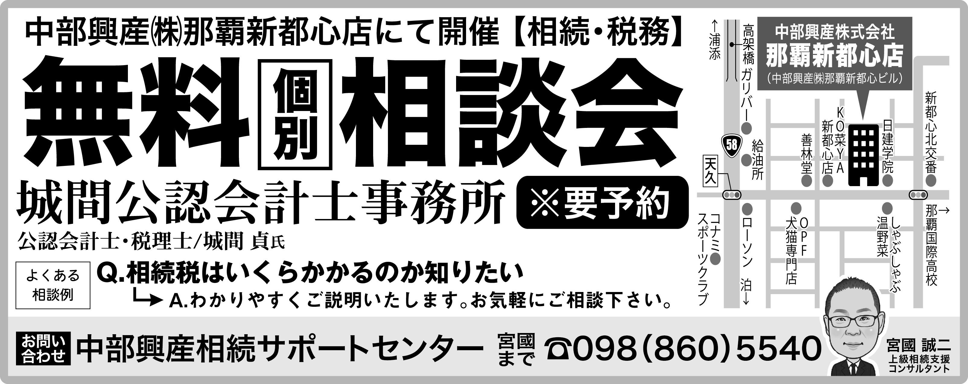 NEW 中部興産相続サポートセンター 【相続・税務】無料個別相談会 中部興産相続サポートセンター 相続・税務無料相談会 開催情報 開催場所 中部興産(株)那覇新都心店 備考 要予約 お電話でのお問い合わせ 主催者・お問い合わせ 会社 中部興産相続サポートセンター TEL 098-860-5540