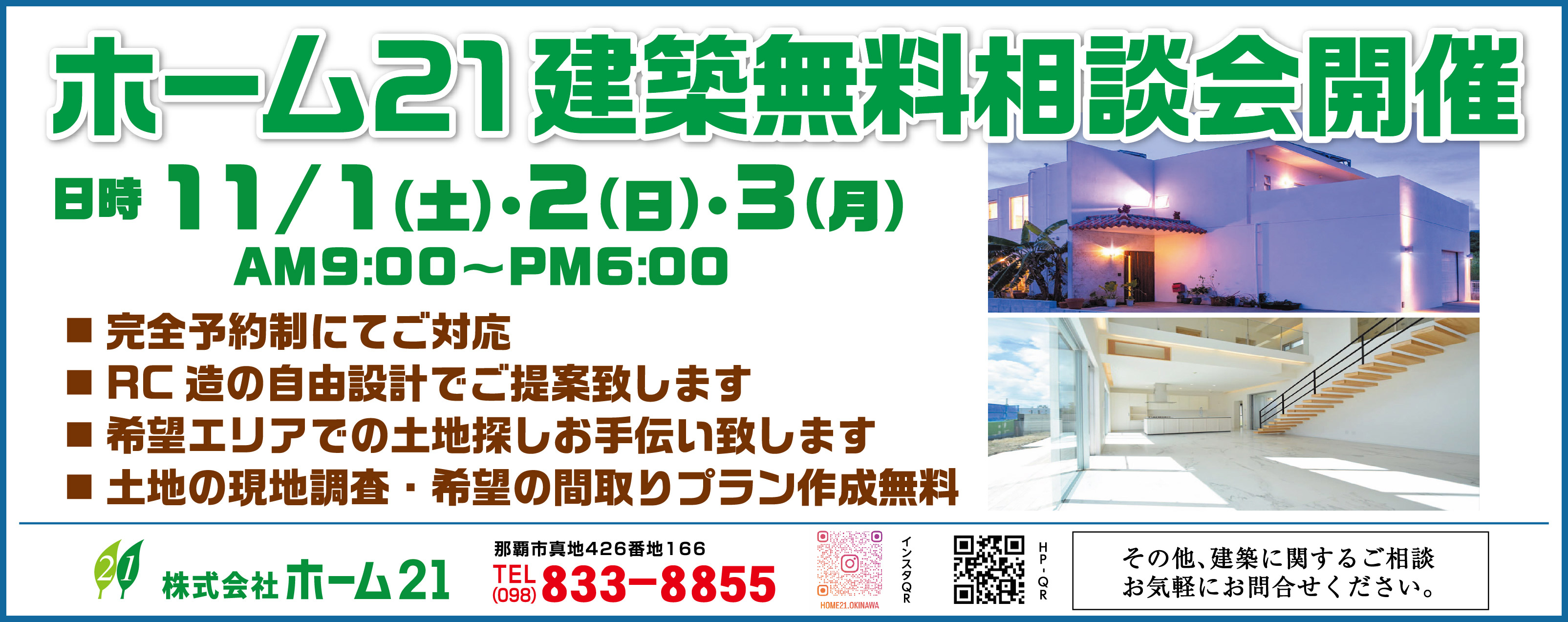 NEW 11/1(土)~11/3(月・祝)にホーム21が建築無料相談会を開催 ホーム21 建築無料相談会 開催情報 日程 11/1(土)~11/3(月・祝) 時間 9:00~18:00 開催場所 那覇市真地 お電話でのお問い合わせ 主催者・お問い合わせ 会社 株式会社 ホーム21 TEL 098-833-8855