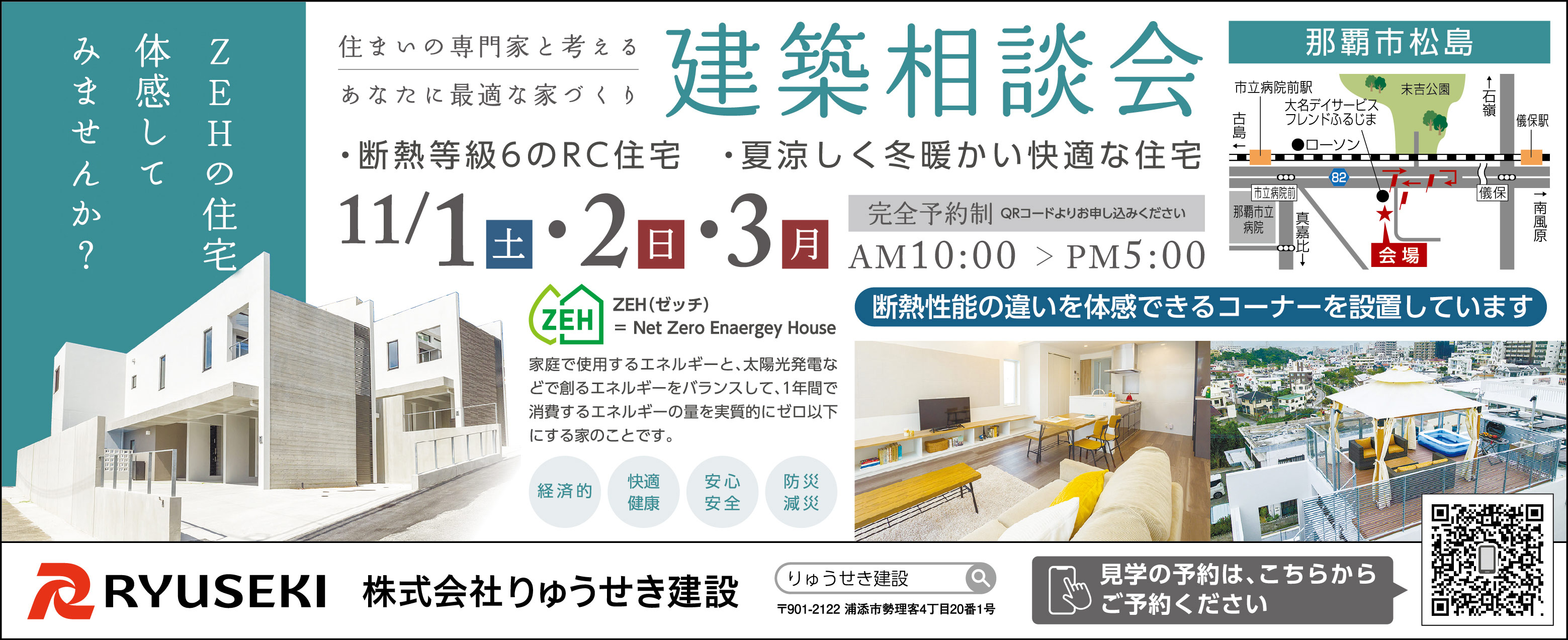 NEW 11/1(土)~11/3(月・祝)にりゅうせき建設が建築相談会を開催 りゅうせき建設 建築相談会 開催情報 日程 11/1(土)~11/3(月・祝) 時間 10:00~17:00 開催場所 那覇市松島 お電話でのお問い合わせ 主催者・お問い合わせ 会社 株式会社 りゅうせき建設 TEL 098-878-3388