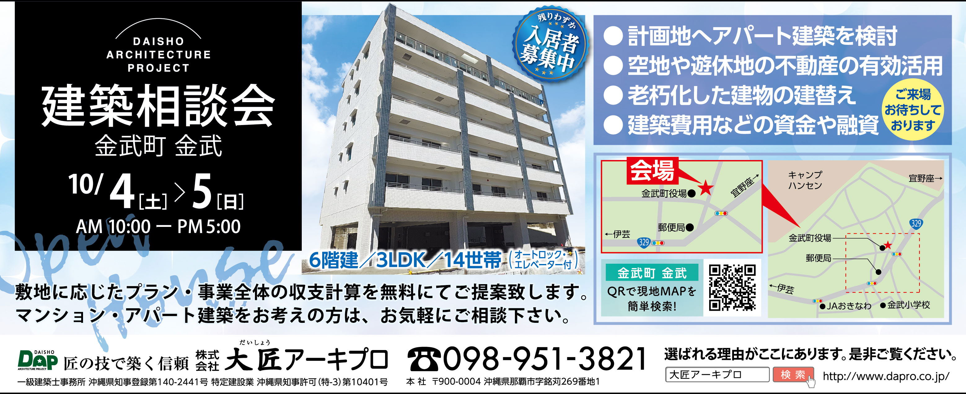 NEW 10/4(土)・10/5(日)に大匠アーキプロが金武町金武で建築相談会を開催 大匠アーキプロ 建築相談会 開催情報 日程 10/4(土)・10/5(日) 時間 10:00~17:00 開催場所 金武町金武 お電話でのお問い合わせ 主催者・お問い合わせ 会社 株式会社 大匠アーキプロ TEL 098-951-3821