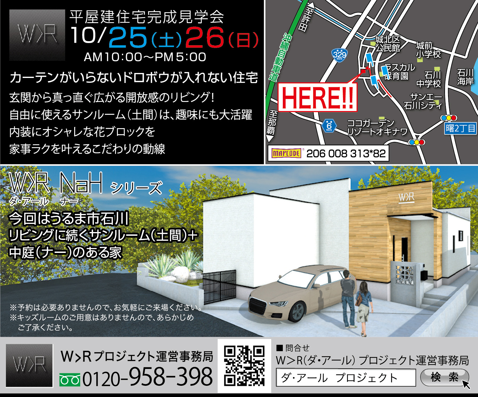 NEW 10/25(土)・10/26(日)にダ・アールが住宅完成見学会を開催 W>R(ダ・アール) 完成見学会 開催情報 日程 10/25(土)・10/26(日) 時間 10:00~17:00 開催場所 うるま市石川 お電話でのお問い合わせ 主催者・お問い合わせ 会社 W>R(ダ・アール)プロジェクト運営事務局 TEL 0120-958-398