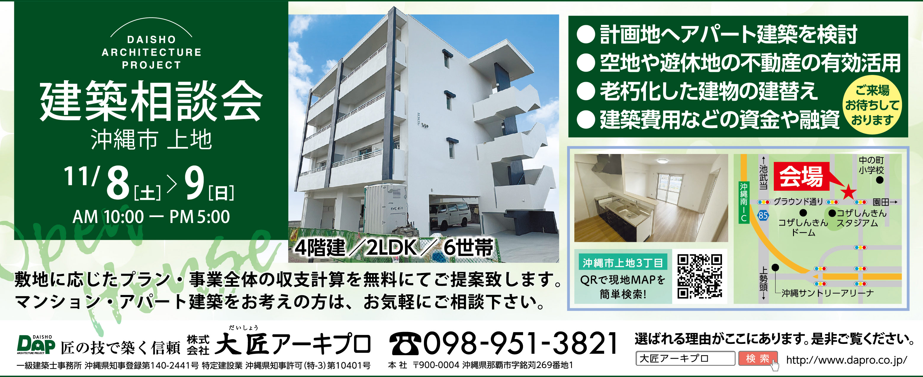 NEW 11/8(土)~11/9(日)に大匠アーキプロが沖縄市上地で建築相談会を開催 大匠アーキプロ 建築相談会 開催情報 日程 11/8(土)~11/9(日) 時間 10:00~17:00 開催場所 沖縄市上地 お電話でのお問い合わせ 主催者・お問い合わせ 会社 株式会社 大匠アーキプロ TEL 098-951-3821