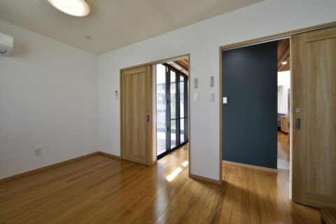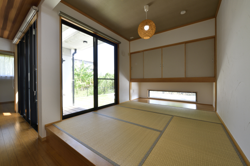 敷地南側に間口がある旗竿地で、南面には隣家が近接。半ば必然的に、東側に大きく開く方向でプランを組み立てました。しかし設計途中、和室を今の位置(東側ほぼ中央)に移したいとの要望があったため、採光計画を再構築。デッキテラス回りに掃き出し窓を並べるのは当初からの予定通りでしたが、十分な明るさを補えるように、LDの天井高を一段上げてハイサイドライトを設けました。また和室が閉じた印象にならないように、吊り押し入れにして地窓を設置し、LDKから見たときの視線の抜け感を確保しました。