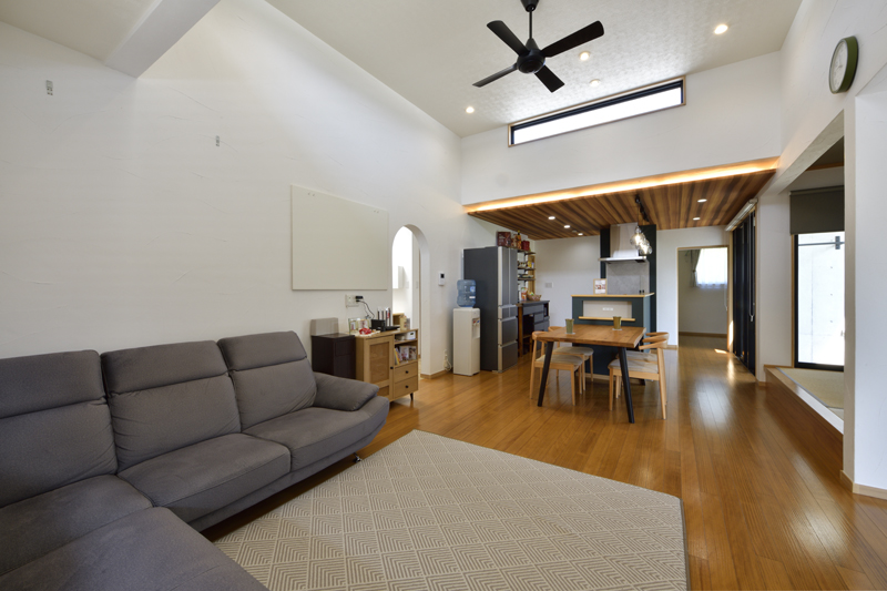 天井高を抑えたキッチンに対し、隣り合うダイニングとリビングはボリューム満点。4m近くの高さがあって吹き抜けのような開放感があり、「遊びに来た親類や友人にも、広々していて気持ちいいと好評です」と奥さま。天井近くにはハイサイドライトが南北2面に取られ、優しい光が差し込んできます。