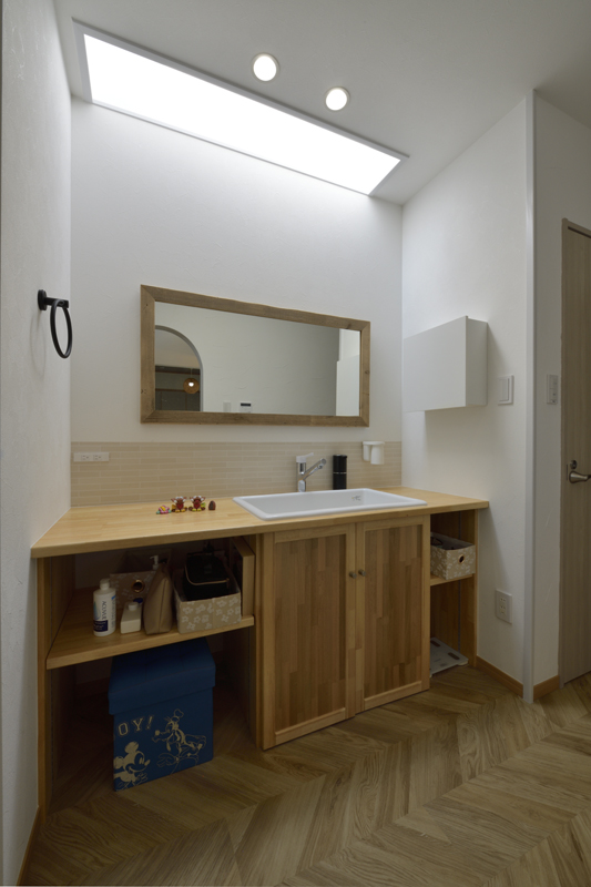 回遊性のある動線設計は水回りにも採用されています。家の西側には、LDKと平行するようにサニタリーが直線上に並び、さらにクローゼットを通り抜けて主寝室ともつながっています。LDKとの間にはキッチン・ダイニングそれぞれにアクセスできる通路があり、家事や身の回りのことを効率的に行えるほか、「バックヤード全体が明るく清潔な雰囲気になるように、洗面室上部にトップライトを入れてもらいました」といった工夫も施されています。