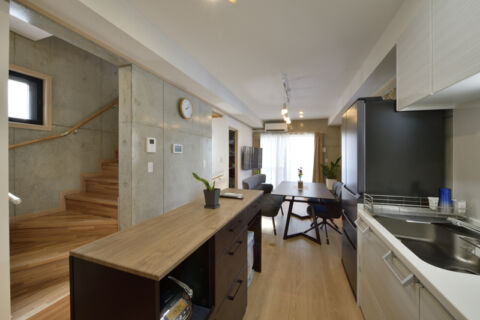 キッチンは空間を広く使える壁つけ式をセレクト、レンジフードの存在感も抑えました。作業台と収納を兼ねたカウンター背面に床材を貼って、全体の統一感を演出しています。