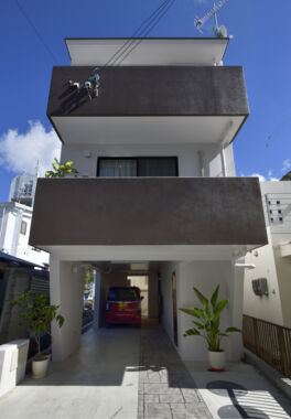 約20坪の敷地に延床面積約35坪の3階建てを。高さのある外観はホワイトとブラウンの2色で陰影が生まれるよう塗り分け、落ち着きあるファサードを演出しています。「限られた面積を有効に活かし、フロアごとの役割を明確に分けた“水平方向につながる家”を提案しました」と話す外間由高さん。2階は家族やゲストが集うLDKをメインに水回り設備をプラスしたパブリックフロア、3階は寝室に特化した3部屋とトイレを設置したプライベートフロアです。