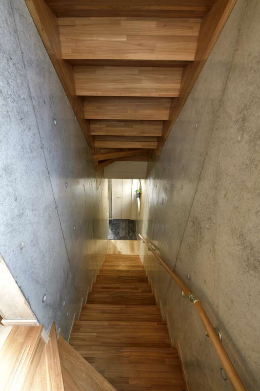 1階はガレージと倉庫、玄関、シューズクローゼットを配置。階段を上っていく途中、頭の上の階段裏側まで木製であることに驚きます。これは、熟練した職人さんの手による造作階段。コンクリート打放しの壁に木製のぬくもりが映えます。