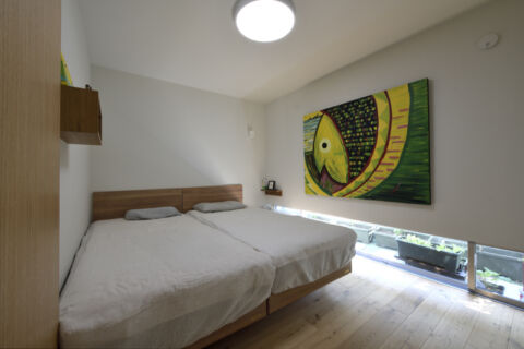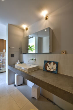 開かれたLDKの東西両サイドには、閉じた箱の中にプライベートな機能を集約。仕事部屋はアシャギのように一度外に出てアクセスする配置とし、私的領域の確保と併せてライフとワークの切り替えを促しています。