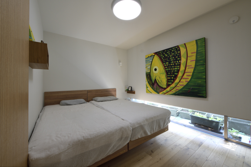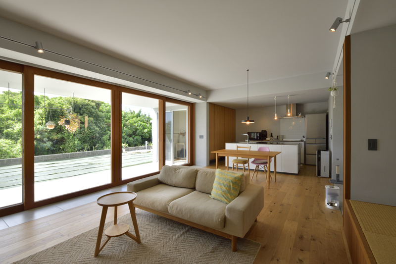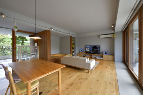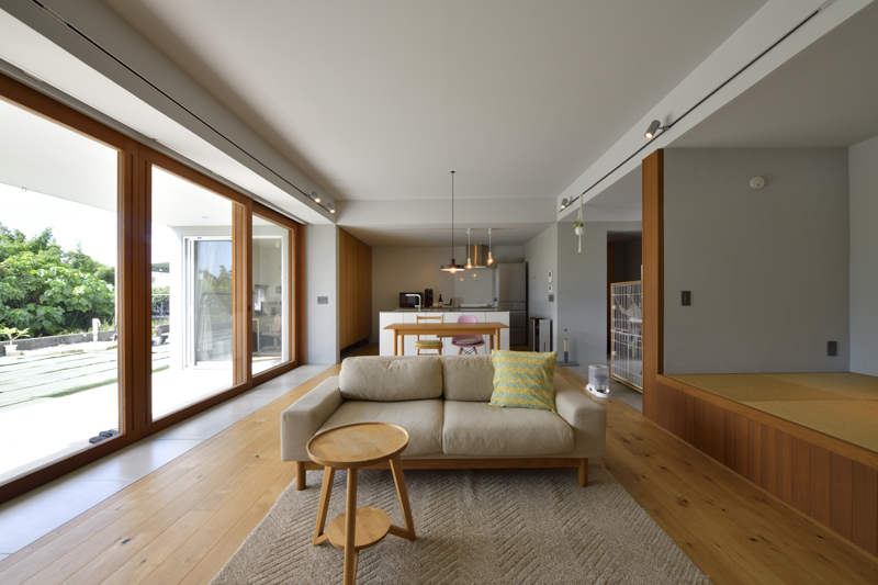 平面形状は建坪35坪の長方形で、東西両サイドに寝室・収納と水回りをまとめたプライベートな箱が置かれています。その間に大きくLDKがレイアウトされ、周囲の緑を取り込むように、木製サッシのガラス戸が南北両面に並んでいます。リビングの横には小上がりの畳間があり、「ここからの眺めが好き。何気なく腰掛けたまま、窓の外を眺めてのんびり過ごすことがよくありますね」。大開口を介した屋外側は深い軒に覆われたテラスになっており、時間帯や天気によって移ろう陰影が、居心地のよさを増幅させています。