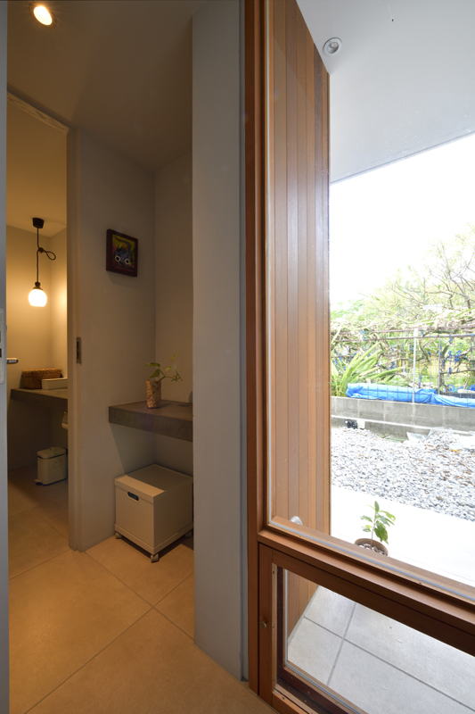 敷地は北側道路に間口が接した旗竿地で、南側には長期的に景観が保証された緑地が隣接。一方で北側の畑は借景かつ通りからの目隠しとして利用できると考え、敷地中央に開放的なLDKを据えて、南北に視線と風が抜けるオープンな空間を創出しました。また室内外をつなぐ緩衝帯として深い軒に覆われた雨端スペースを設け、空間の濃度がレイヤー状に展開していくように計画しました。その中で周囲の自然との調和を意識して、大開口には木製サッシを採用したり、テラスに面した床だけを同じタイル張りにしたり、内と外がシームレスに連続するように工夫しています。