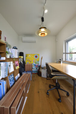 南側テラスの両脇には、リモートワークに最適な個室が2つ。室内からはつながっておらず、お二人は毎朝テラスを通って「出勤」します。いわばアシャギのような離れ部屋になっており、「会議中などに声を張っても音漏れの心配がないのが一番。お互いに気を遣うことなく仕事に集中できます」。ランチや休憩時も一度屋外へ出ることで気持ちがリセットされ、「持ち帰った資料をダイニングテーブルへ広げて、”残業”することも多々あります」。