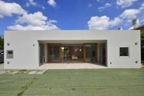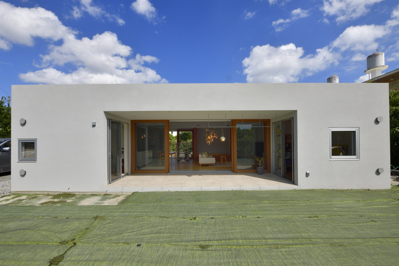ディテールまで計算されたシンプルなデザインに、低重心の端正なプロポーション。西原町の住宅街に建つGさん宅は、夫婦2人が暮らす平屋のRC造住宅です。開口部の操作や素材使いによって、敷地の南北に広がる緑地と畑が日常の一部のように感じられ、コロナ禍以降、在宅勤務という働き方を選んだお二人のライフスタイルにも無理なく対応。雨端、アシャギといった沖縄民家の伝統的な要素も踏襲しており、すっきりと整った空間の中には、場所・人・時間に関わる無数の情報が蓄積されています。