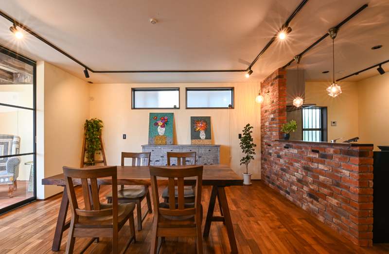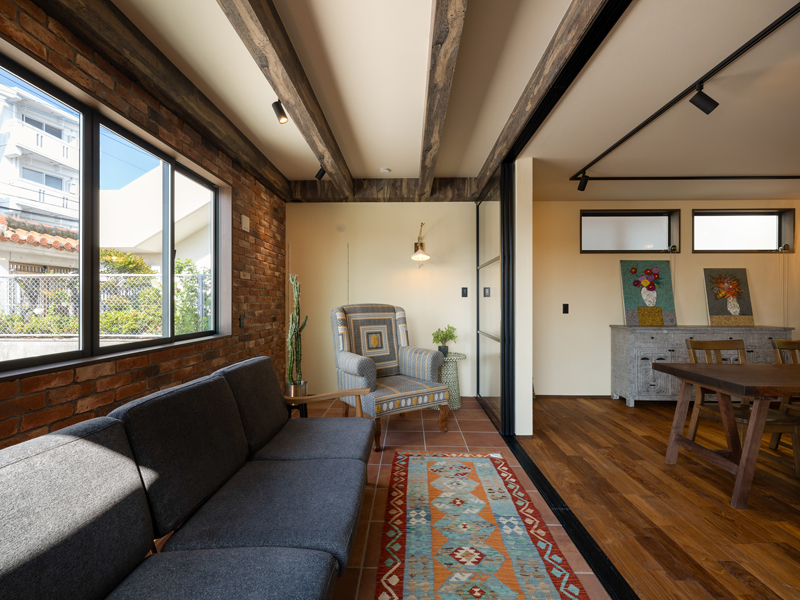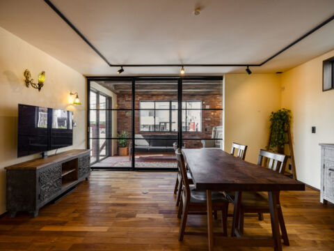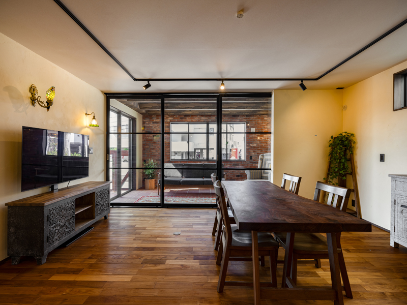 1階姉世帯のコンセプトは「アーティスティックなシェアハウス」。エキゾチックで重厚感のあるインテリアは、「海外でのキャリアがあり、旅行が好き。ロンドンのソーホーのように多様性があって自由な空間にしたい」という要望を形にしたもので、場所ごとに多種多様な素材が使われています。さらに「緑をいつも身近に感じたい」とのリクエストに応えるべく、中庭に面したリビングの一部をガラス戸で仕切れるようにし、潤沢な採光を得ながら植物を育てられる「グリーンルーム」にしました。