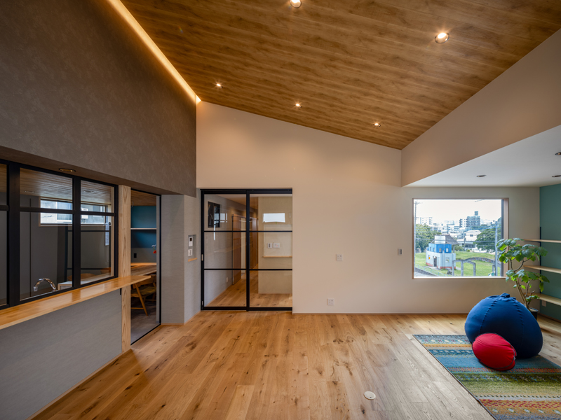 勾配天井に包まれた2階リビングからは、ピクチャーウインドー越しに目の前の公園を展望。1・2階で姉妹それぞれの生活を楽しみながら、家族の絆を深めています。