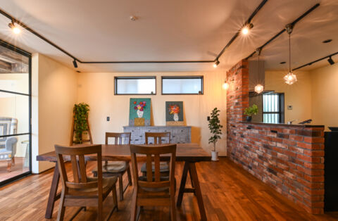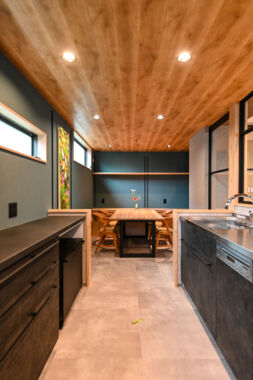2階妹世帯は「食と憩い」を楽しむカフェスタイル。「食は暮らしの中で特に大切」との観点から、LDK全体の緩やかなつながりを保ちつつ、キッチンとダイニングは独立性のある専用ブースとして計画しました。サードウエーブ系のカフェを意識してデザインしたキッチンは、リビングとの間にアイアンウインドーを組み込むことで程よい距離感を確保。ダイニングにはテーブルとベンチシートを造作し、食事をしながら家族の会話を育む憩いのスペースになっています。